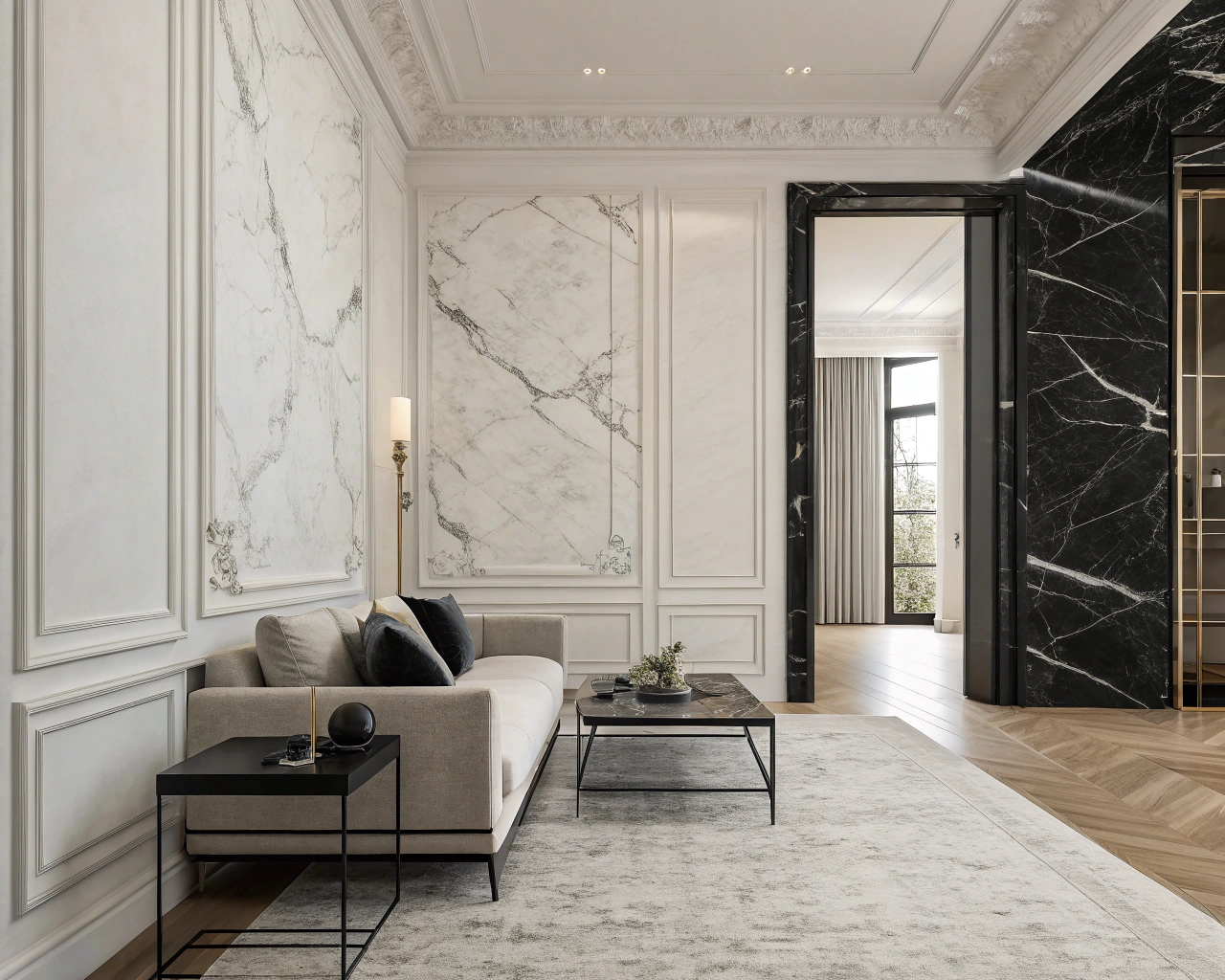 なぜ質感やパターンが重要かというと、モノトーンは色数が限られるため、単調になりやすいからです。例えば、無地の白壁紙とストライプやヘリンボーン柄のグレー壁紙を組み合わせることで、シンプルながらも表情豊かな空間が生まれます。最近では、韓国風のシンプルなモノクロパターンや、大理石調のデザインも人気です。質感の違いをアクセントとして使うことで、空間に奥行きや高級感をプラスできます。